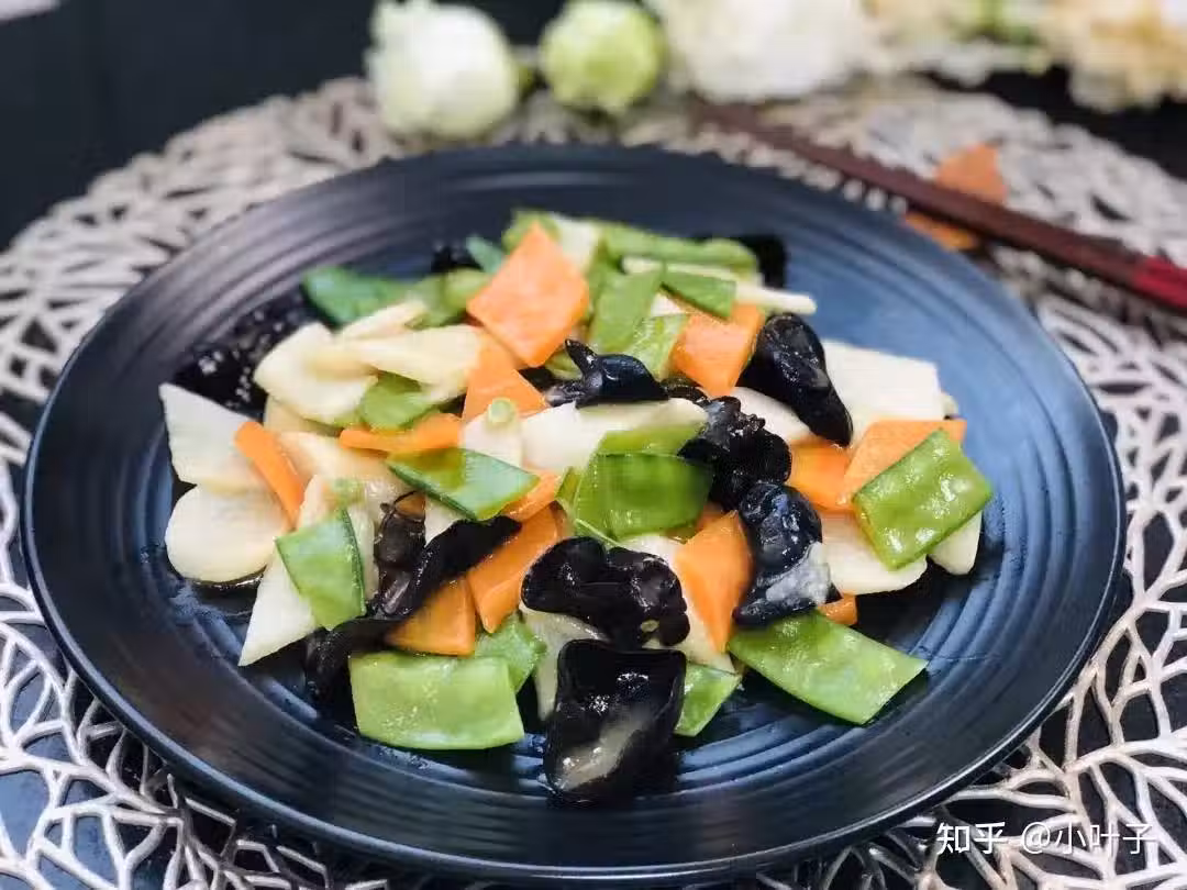 1. 黑木耳可以事先泡發;2. 將胡蘿蔔斜著切成小段,再切片,山藥也是同理;3. 荷蘭豆也斜切成小段;4. 熱鍋入油,依次加入胡蘿蔔、山藥、黑木耳,最後放入荷蘭豆翻炒;5. 加1克鹽,最後加15克左右的水,蓋上量杯蓋~ 准調芡汁;6. 加入調好的芡汁~攪拌一下出鍋。