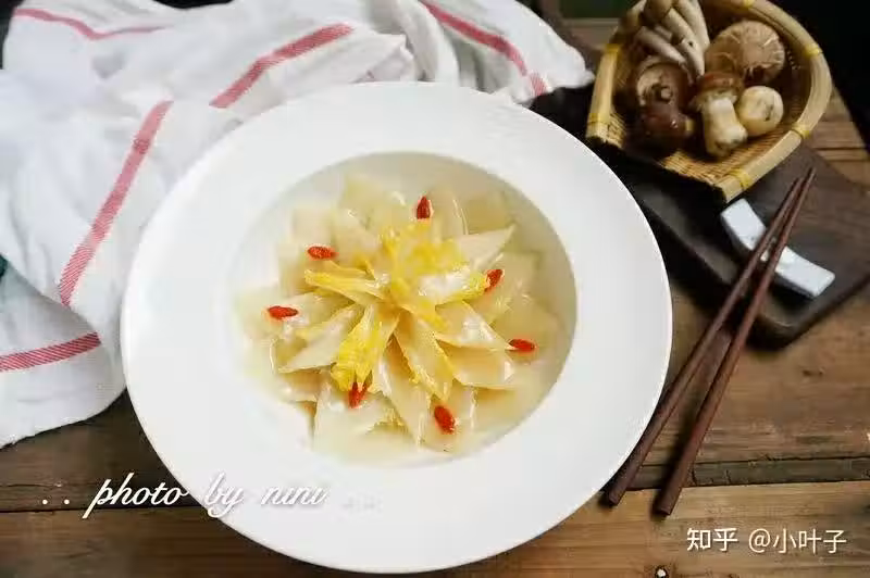 -做 法-1. 將各種菌菇、胡蘿蔔、玉米洗凈切好2. 鍋子加熱,干鍋放入菌菇煸炒到出水3. 加入清水,胡蘿蔔和玉米,熬煮半小時4. 娃娃菜對半切開5. 將每一片菜葉都修剪成尖角6. 撈出湯料,將娃娃菜放入清湯中煮熟7. 湯汁加入鹽、鮮蔬粉、麻油調味,澱粉水勾芡,澆上菜中即可