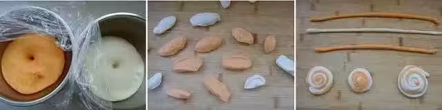 10 . 雙色劑子輕壓扁,包入餡料,搓圓。