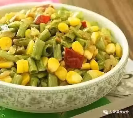 4.下入熟玉米粒與空心菜梗,炒勻;