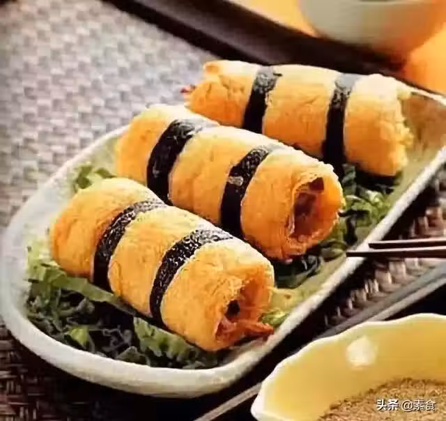 4.紫菜條面端沾少許麵糊,裹住豆包卷(每卷裹兩條紫菜),入油鍋小火煎熟即可。