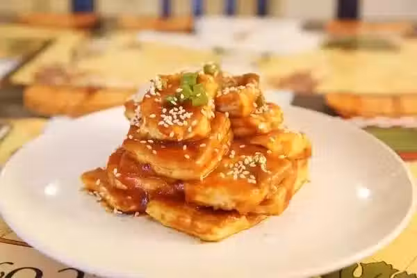 5、最後將魚香汁均勻地淋在豆腐塊上,外焦里嫩的魚香脆皮豆腐就做好了。
