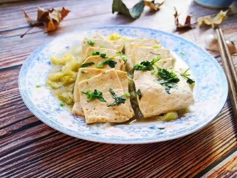 5、再把豆腐放在白菜上面,加適量鹽,慢慢燉