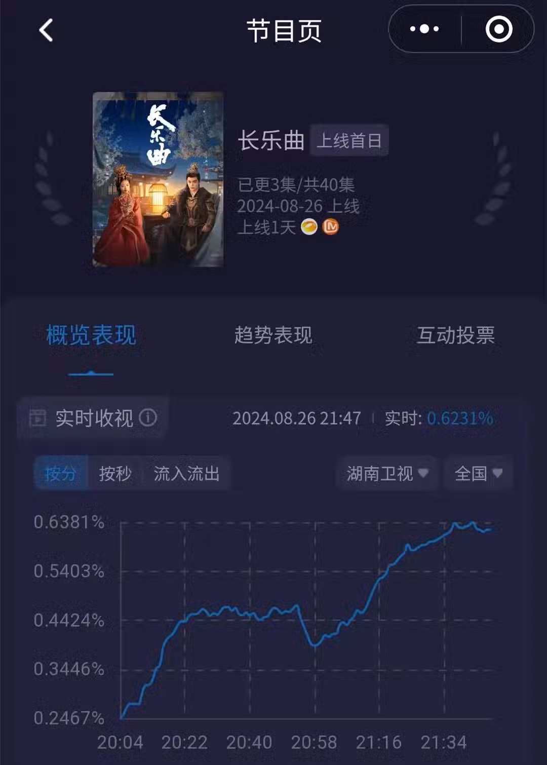 8月26日晚間,電視劇《長樂曲》在湖南衛視兩集首播。這部電視劇由丁禹兮、鄧恩熙主演,講的則是古裝架空環境當中,男女主角先婚後愛,並且一起查案子的故事。按理說,這種題材路數的電視劇,已經屬於夕陽產業了,典型的老舊題材。但是,不看不知道,一看嚇一跳,酷雲實時的收視率顯示,這部《長樂曲》的收視率起飛了。