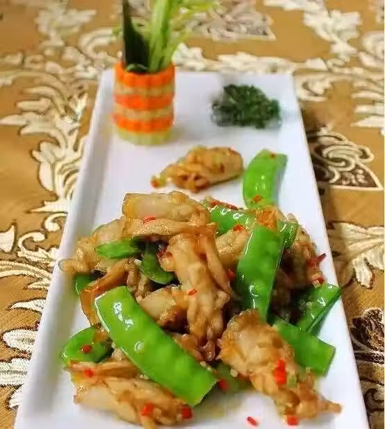 4、另起鍋、鍋中放入少許油放入薑末、香芹末、紅椒末、煸香加入少許水、再加入少許鹽、磨菇粉、胡椒粉、芝麻油、再加入飛過水的荷蘭豆和炸好的杏鮑菇、快火翻炒均勻出鍋裝入盤中即可。
