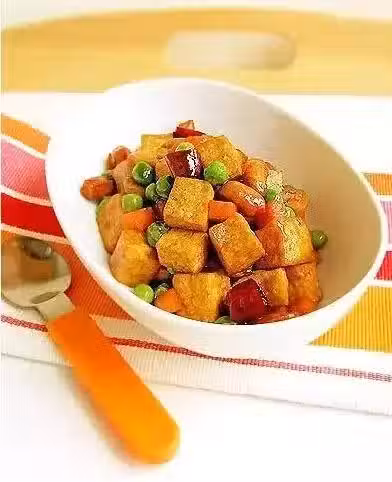 原料:北豆腐1塊、胡蘿蔔1/4根、豌豆少許、花生少許、干辣椒4根(辣椒的量隨意)、花椒少許、姜4小片、白糖1小匙、生抽1小匙、陳醋1小匙、香油1小匙、鹽少許。