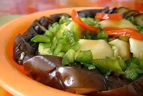 原料:茄子一根、土豆一個、青椒一個、紅辣椒三片、鹽、醬油、核桃油