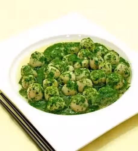 烹調此菜關鍵:菠菜末和小芋頭下鍋後,動作要快,因為菠菜末和小芋頭極容易發黑。另外還有一種烹調方法,就是小芋頭蒸好後,把湯潷出去,菠菜汁打芡澆在小芋頭之上。