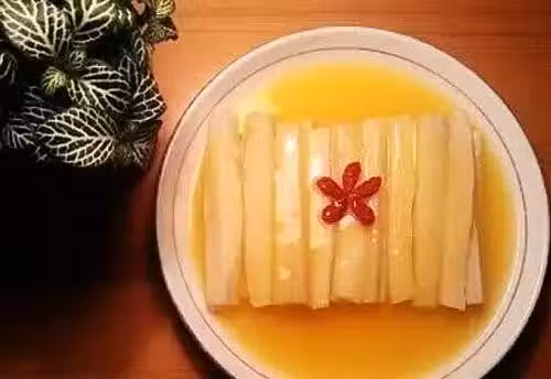 2、橙汁加熱,勾芡成汁。將加工好的橙汁淋在山藥上,浸泡入味,放上枸杞即可。