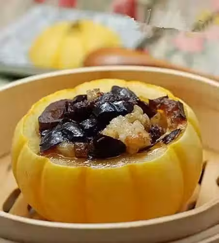 4、加上南瓜蓋,放入一個碟子裡,再放入鍋中隔水蒸熟即可。