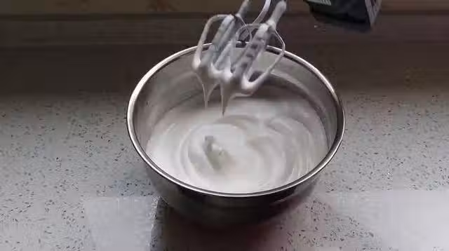 2.蛋清放在一個無水無油的盆里,放1克食鹽,幾滴白醋,80克白砂糖,用電動打蛋器低速打發至白糖融化,再用高速打發至提起打蛋器有三角的形狀而且不倒的狀態就可以。