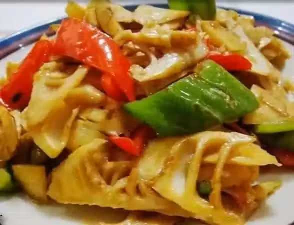 2、起鍋熱油先放入筍片翻炒至略有金黃色再放入尖椒快速炒幾下同時加入生抽、少量白糖、蘑菇精再淋上少許水分炒至色澤均勻即可。