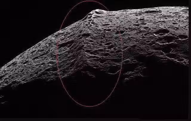 土衛八的赤道脊不僅看起來十分突兀,還是由多種複雜地形一併構成的, 其中有獨立的山峰也有懸崖。