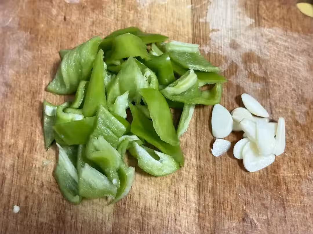 5、熱鍋涼油加入蒜片炒香,下入茄子和青椒塊,把水分翻炒至變干。