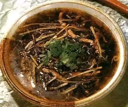 3、髮菜是一種名貴的乾菜,原生長在高原地帶陰濕山間石坡上,採收曬乾即成,其味甘性寒具有清熱消滯,理腸除垢作用,對心血管疾病、貧血、慢性氣管炎、癌腫瘤等均有一定療效。