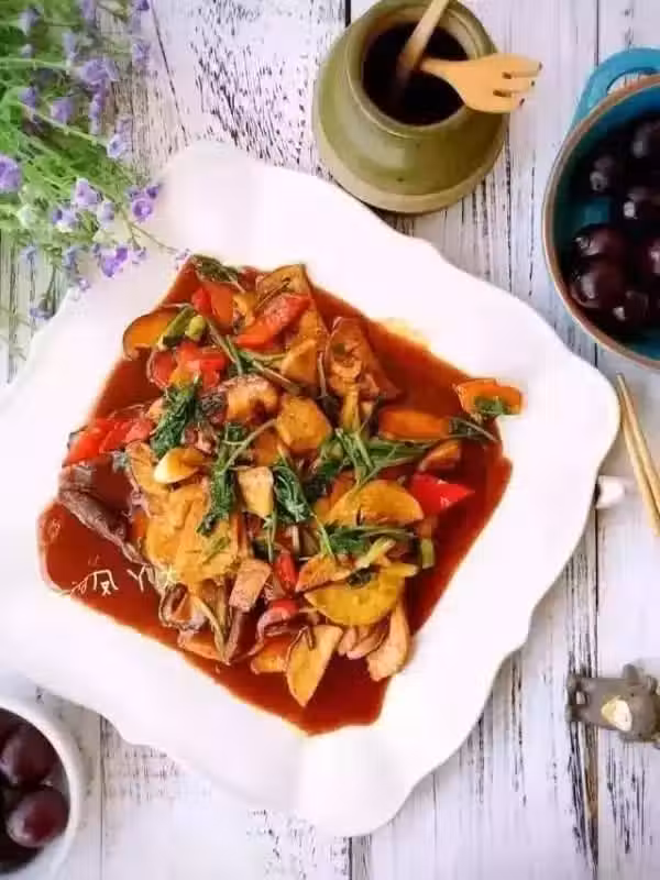 素雞一個/紅椒一個/香菇兩朵/杏鮑菇一個/孜然少許/黃豆醬少許/老抽少許/香菜少許(可不放)