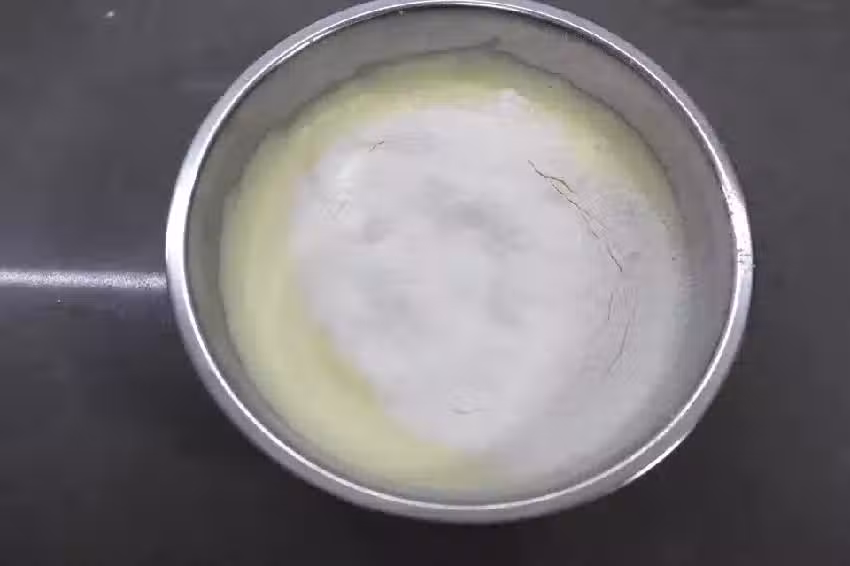 6. 將牛奶倒入玉米油碗中,用手抽將二者混合均勻,無油花狀;