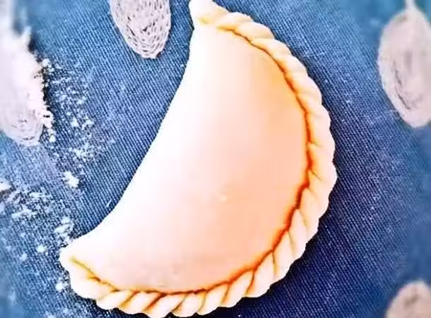 餃子皮對摺捏合後,從一邊角起,向內折壓;之後沿著第一個摺痕,依次向內鎖邊,就可以看到花邊的樣子啦。