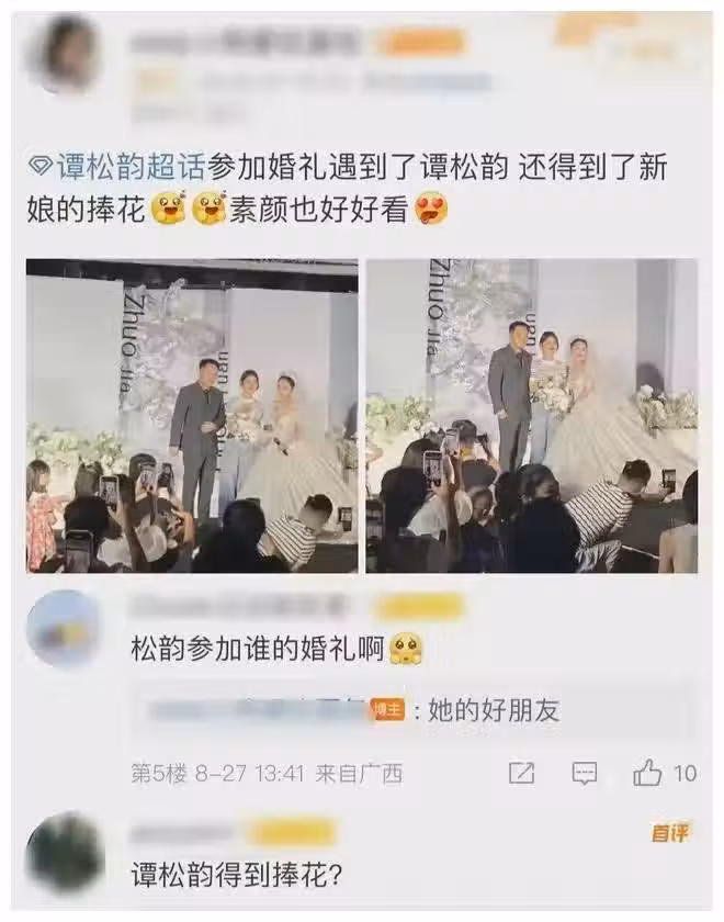 譚松韻身穿黑白條紋上衣搭配牛仔褲,清新淡雅。她在婚禮上拿到了新娘的手捧花,並站在新郎新娘身後,獻上了祝福之花。網友們紛紛稱讚她是一位非常可愛的女孩,穿著簡單卻一點也不搶新娘的風頭。