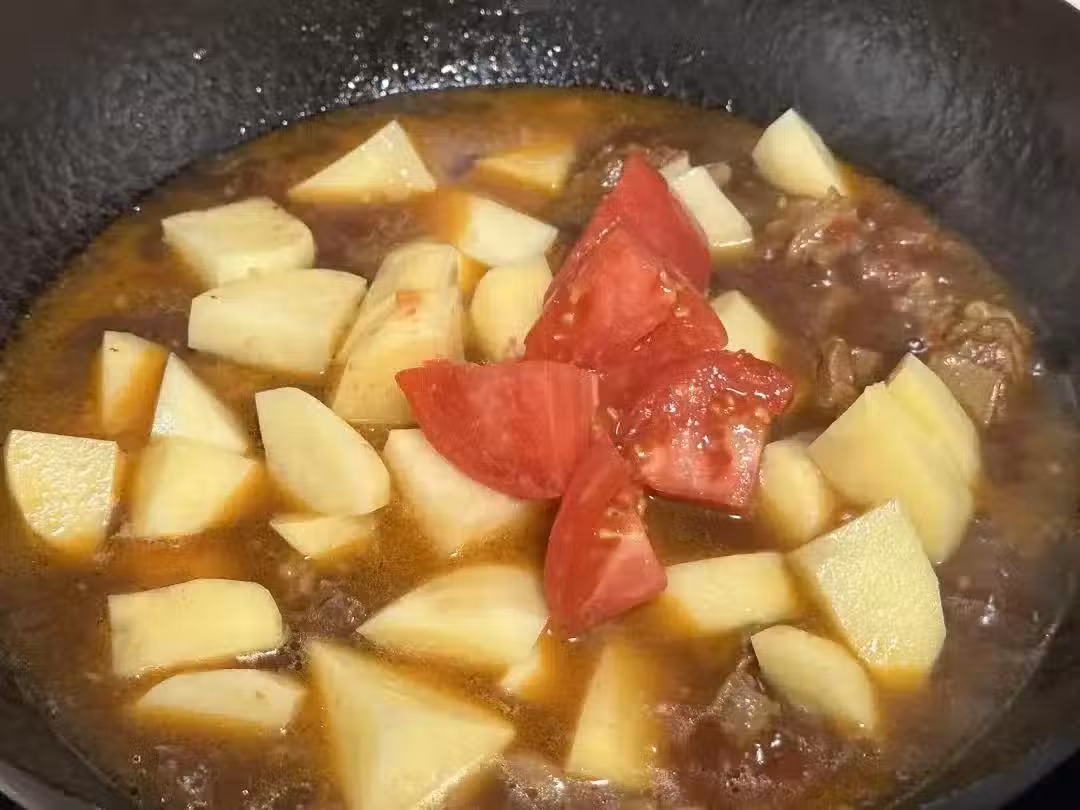 6、食材全部熟透,補1勺鹽,大火收汁,湯汁粘稠就可以,出鍋加點香菜或者蔥段。