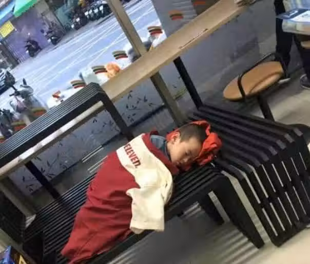 因為疲倦,小孩在等候父親的過程中就在超商的椅子上睡著了。