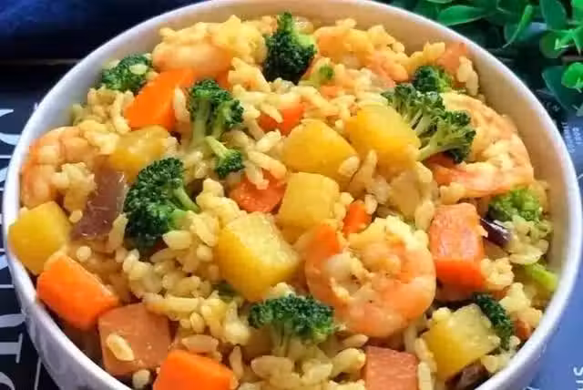 3、加入溫開水200ml,煮至冒泡加入大蝦,西蘭花翻炒至濃稠,最後倒入米飯,鹽適量,拌勻即可。