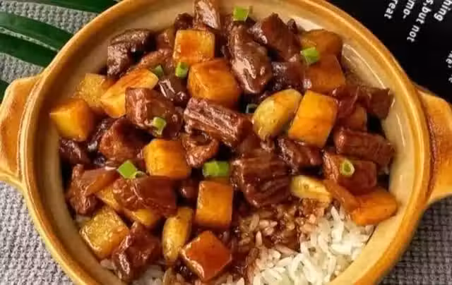 4、鍋中留底油,倒入土豆胡蘿蔔炒至微焦,倒入洋蔥炒香,倒入牛肉,加入醬汁煮至濃稠即可。