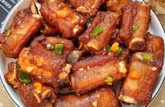 3、熱鍋放油至七成熱,放入排骨炸至定型,再復炸一分鐘,撈出控油備用。