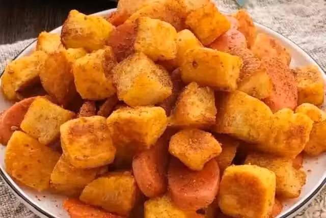 2、土司丁放入蛋液裹滿蛋液,油熱放入土司炸至金黃,放火腿片翻炒均勻,出鍋放辣椒粉,椒鹽粉即可。