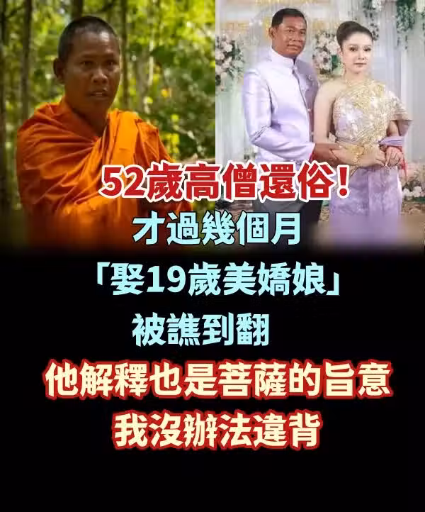 相信很多人對於出家人的想像,似乎就是在寺廟中潛心佛法、不能成婚、一輩子過著孤獨又寂寞的苦行生活!然而最近東南亞有位52歲高僧還俗之後,不但立刻迎娶一位年僅19歲的仙女美嬌娘之外,兩人訂婚儀式的照片曝光後,更是在網絡上引起一陣轟動的熱議!