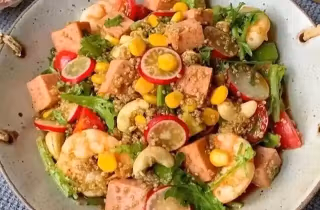 食材:大蝦八隻,午餐肉清淡味半盒,櫻桃水果蘿蔔五顆,聖女果六顆,牛油果半個,甜玉米粒適量,藜麥米適量,腰果10個,綠色時蔬少許。