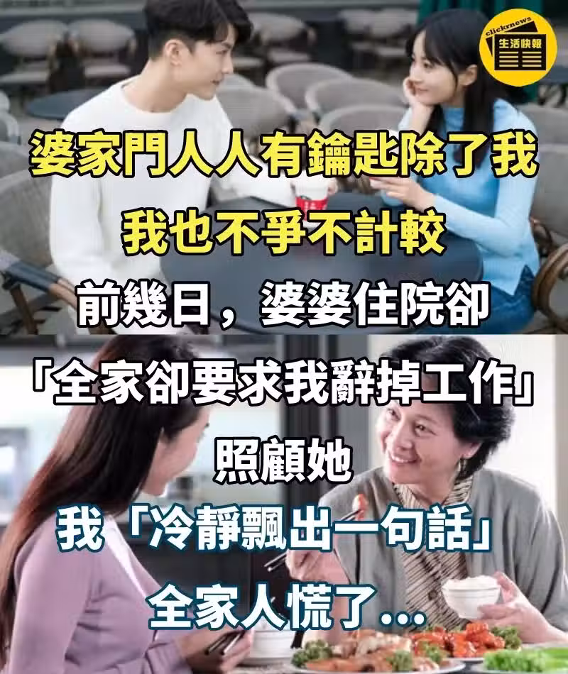 婆家門人人有鑰匙除了我, 我也不爭不計較。前幾日,婆婆住院卻「全家卻要求我辭掉工作」照顧她,我「冷靜飄出一句話」全家人慌了...