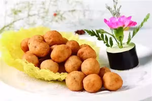 2、炒鍋上火,放油待燒至七成熟後、用手將南瓜、紅薯、土豆茸擠成鵪鶉蛋大小的丸子,入熱油鍋中炸至金黃色撈出;