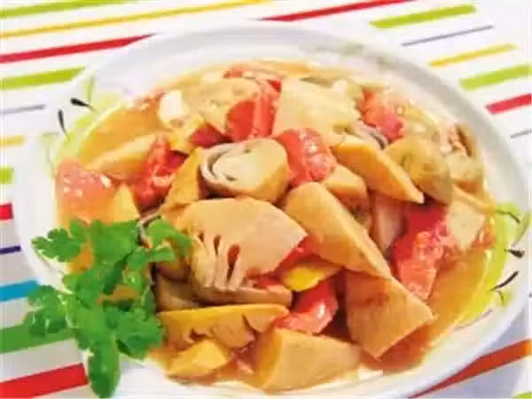 4、加入素高(或原湯)湯、筍塊、草菇、燜約30分鐘,加入調味料,用澱粉水勾薄糊淋上,起鍋裝盤,素火腿片放在上面便成。