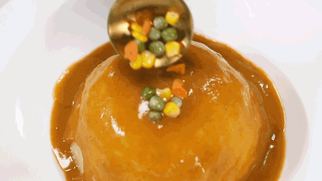 8. 土豆泥放入碗中,淋上醬汁和青豆玉米胡蘿蔔粒