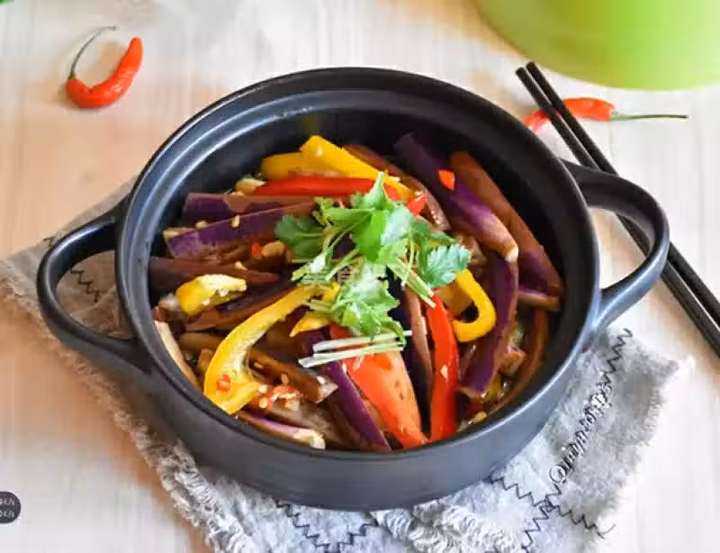 7、砂鍋燒熱,把炒鍋中的茄子倒入