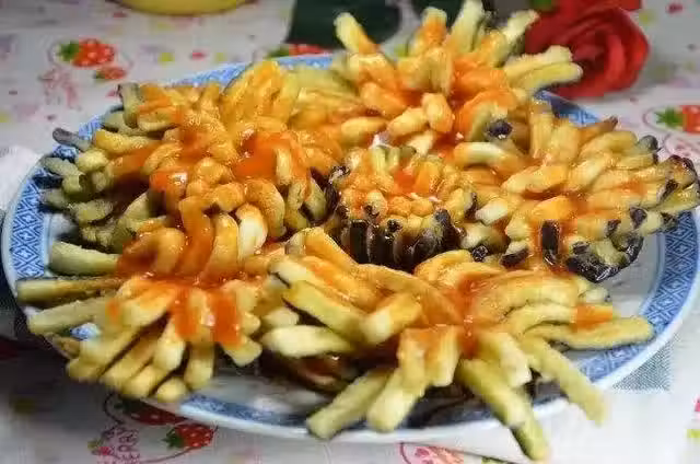 2、勺內入油,燒七、八成熱,放入茄花炸好,倒出瀝油,擺入盤內。