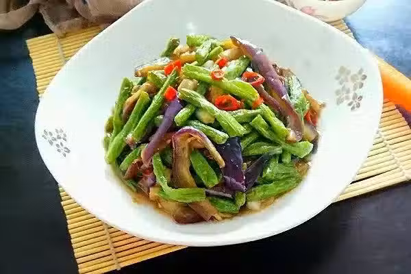 茄子一條,長豆角5根,辣椒、生薑、生抽、食鹽、植物油適量