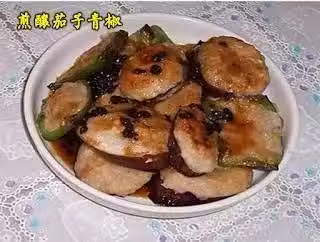 2. 茄子切片,青椒切件,塗上少許生粉,再釀上芋泥。