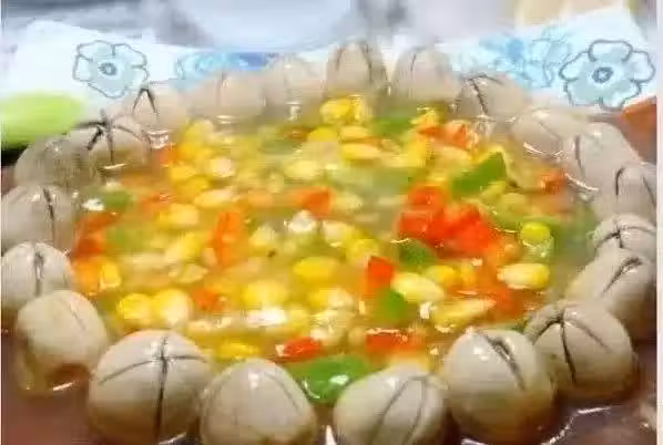 2、燒鍋下油,爆香薑末,放入熟玉米粒、青紅椒粒翻炒,加少許水,調鹽、蘑菇精、糖,燒開後勾欠,澆在草菇中間即可。