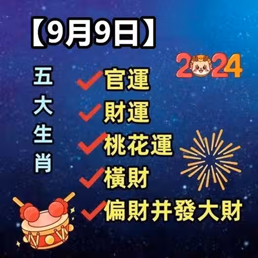 9月9日:官運 財運 桃花運 橫財 偏財並發大財的5生肖