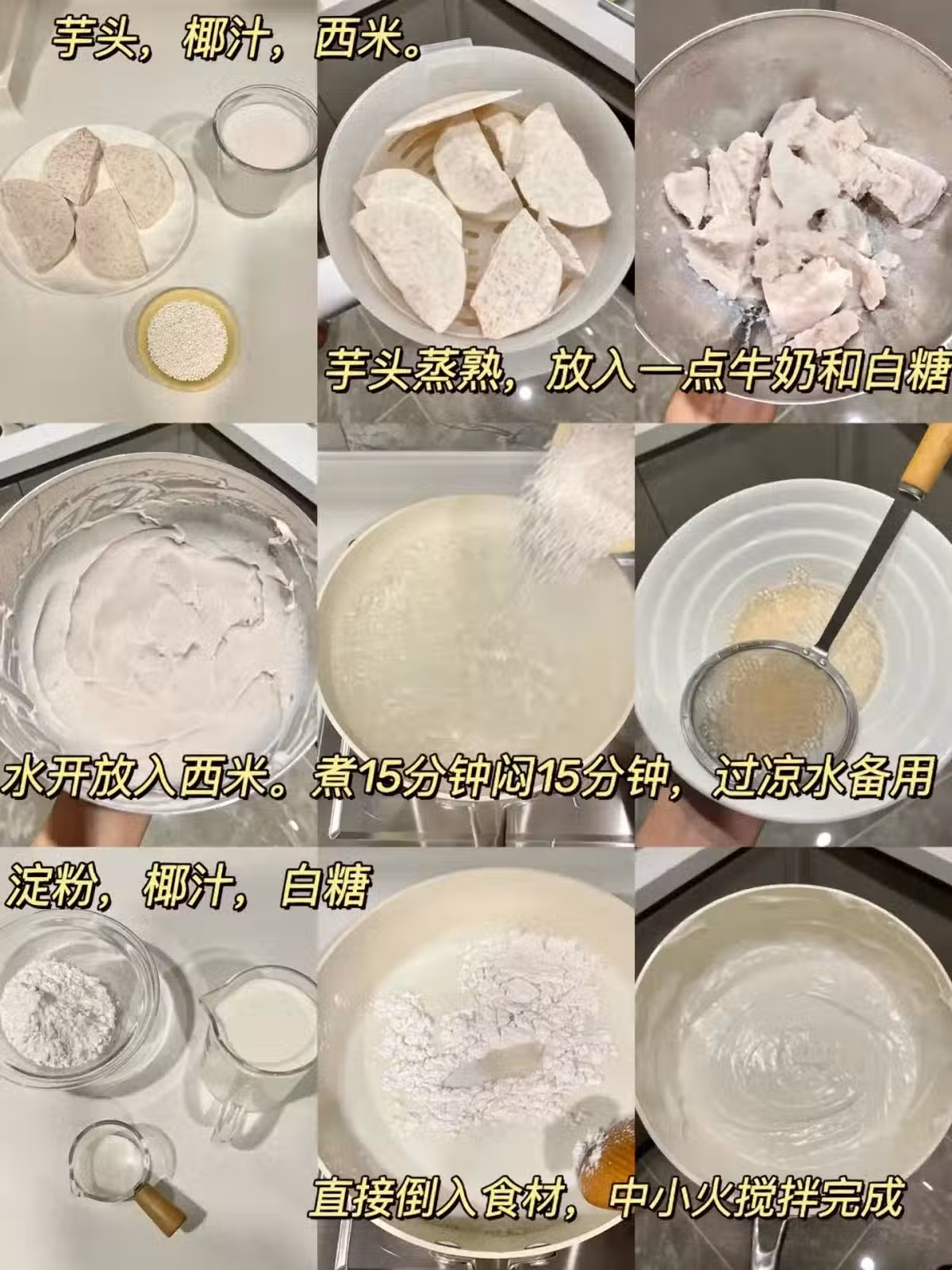 芋頭甜品(小吃)】01.熬制:鍋里加水➕多些白糖,放去皮荔浦芋頭,去皮紅薯塊,淹住芋頭塊和紅薯塊,一起煮25分鐘左右,➕牛奶➕椰汁粉,大火熬煮到粘稠,11.