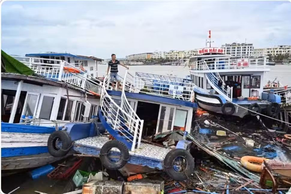 颱風「摩羯」襲擊海防市,人們事後在被洪水淹沒的街道上整理堆集殘骸。(圖取自法新社)