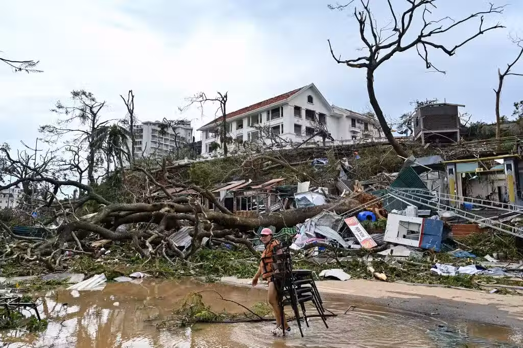 在廣寧省下龍市,一名婦女在廢墟和倒下的樹木中撿起一個椅子。(圖取自法新社)