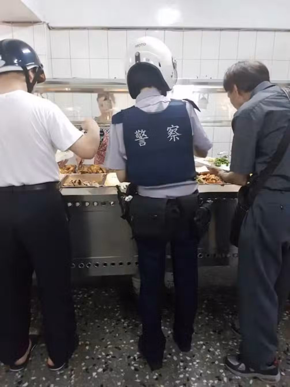 一位台北市員警在自助餐店頭戴安全帽、身穿警察制服、腰間配槍挾菜,竟被網友拍下,上網公審道:「我可以體諒警察的工作辛苦、我可以體會輪班的辛勞,但是去買便當,個人真的覺得不是那麼合宜。先撇開是否為執勤中,執勤中可以買便當?非執勤中可以帶槍?」