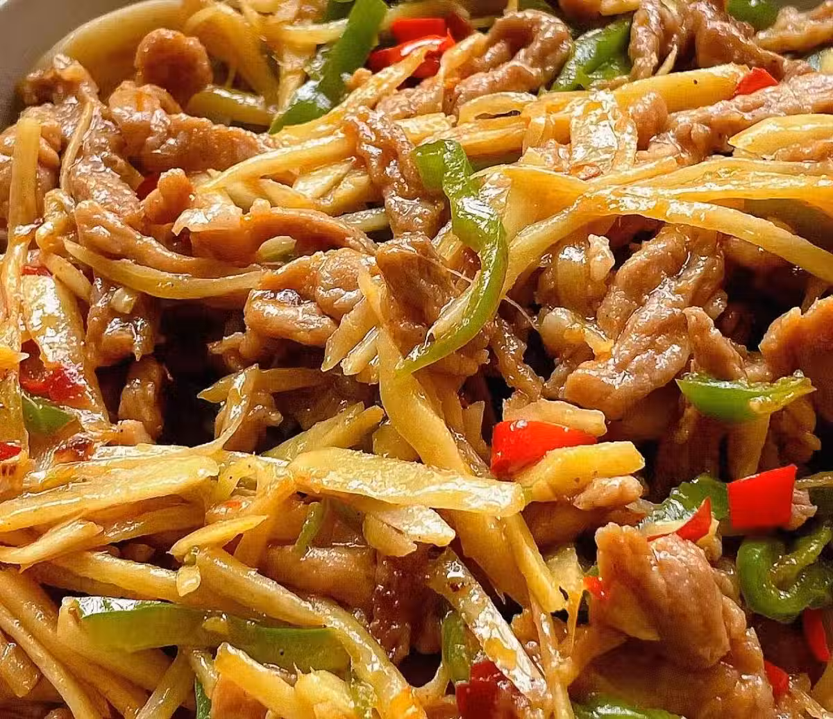 4、鍋中余油炒軟仔姜和青椒絲,倒入肉絲,加鹽和雞精快速翻炒出鍋。