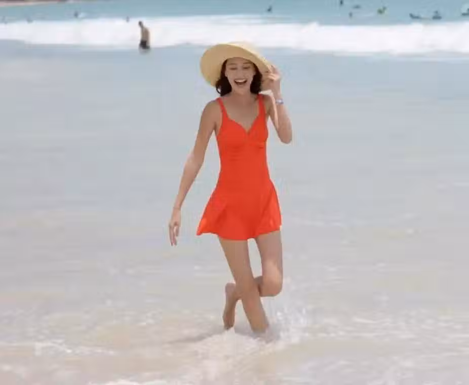 陳凱琳戴著遮陽帽,穿著紅色泳裝裙,赤腳在海里戲水,她對著鏡頭露出超級燦爛的燦笑,真是隔著螢幕都被美到了。