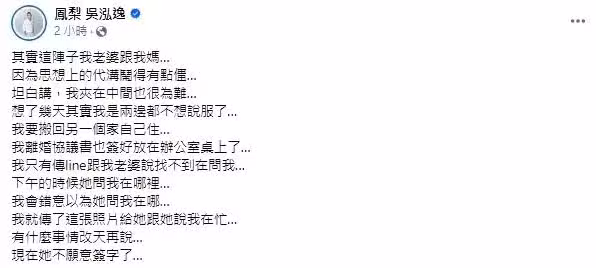 今日鳳梨在臉書發布貼文,表示這陣子老婆跟媽媽的因為思想上的代溝鬧得有點僵,鳳梨坦言夾在中間十分為難,兩邊都不想說服,打算搬回另一個家自己住,「我離婚協議書也簽好放在辦公室桌上了」。