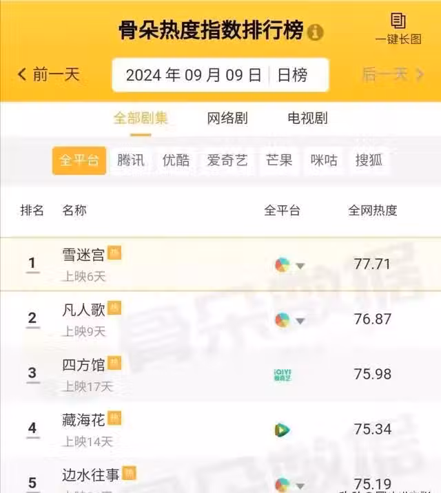 電視劇全網熱度榜,《邊水往事》排在第五,,第一熱度高達77.71