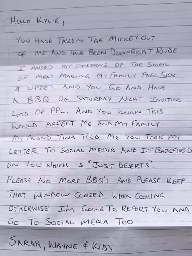 鄰居下了最後通牒,要求Kylie不要再烤肉、煮飯時把側邊窗戶關上,否則也要比照辦理po上網。